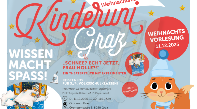 Die kostenlose Weihnachtsvorlesung bietet Platz für 600 Schülerinnen und Schüler der 3./4. Volksschulklasse und ist ein Kooperationsprojekt der Pädagogischen Hochschule Steiermark und der KinderUniGraz. Gestaltet wird die Weihnachtsvorlesung von Studierenden und Lehrenden der Primarstufenausbildung der Pädagogischen Hochschule Steiermark.